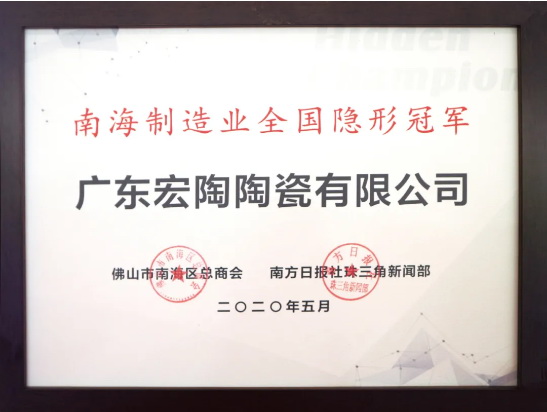 广东宏陶陶瓷有限公司荣获“南海制造业全国隐形冠军”牌匾