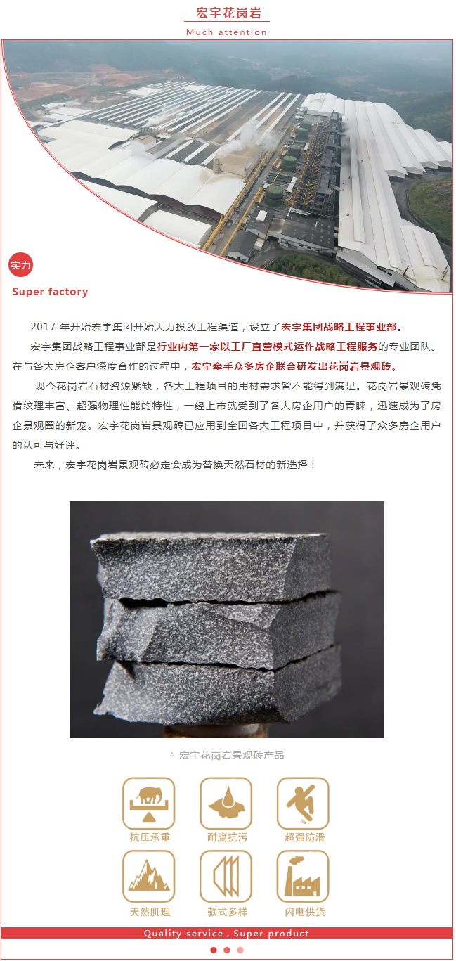 截止至今,宏宇花岗岩景观砖在全国前三十强房企的使用率超过80&b!