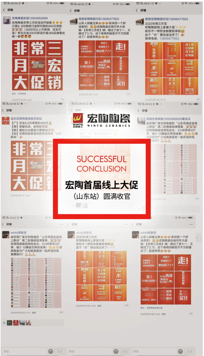 3月8日,在全国线下门店还未营业的情况下,宏陶举办的“非常三月宏”线上山东省联动,将门店的流量、用户、产品引入线上,实现门店和消费者连接的重构。此外,针对销售环节需求,在微信小程序、天猫旗舰店等成熟渠道构建智能购砖场景,建立与消费者的线上沟通互动。同时推出线上购砖,享受线下门店同质服务,全面满足消费者足不出户焕新家装的需求。丰富的产品、专业的服务加上适度的促销引流,成功签单2000多单。