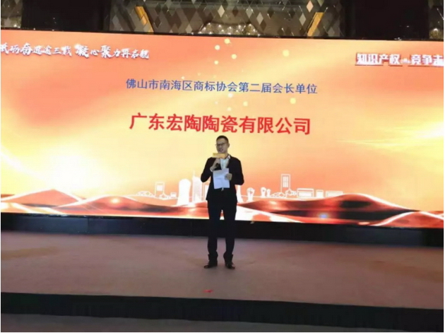 宏宇集团一直以来非常重视包括商标在内的知识产权保护,为建陶行业的知识产权保护提供了很多成功案例。宏宇集团下属五个陶瓷品牌都曾获得过广东省著名商标,还有四个品牌被认定为中国驰名商标,为品牌的市场推广和产品销售起到了非常大的助力作用。宏宇高品质的产品在商标品牌的护航下,源源不断输出到全国各地甚至全球数十个国家和地区。当消费者看到我们宏宇的商标品牌,就会联想到品质卓越的广东制造、广东砖。这是宏宇集团二十几年坚守高品质的结果,也是长年累月坚持做好商标知识产权保护的体现。今天,我们宏宇集团下属宏陶公司新任南海区商标协会第二届会长单位,在知识产权保护方面我们有了更大的责任,要为广大企业做出更好的表率,承担起更大的使命担当。
