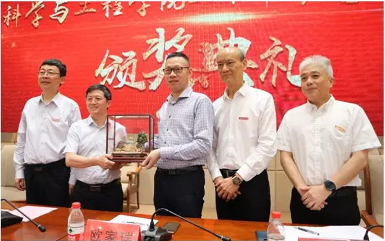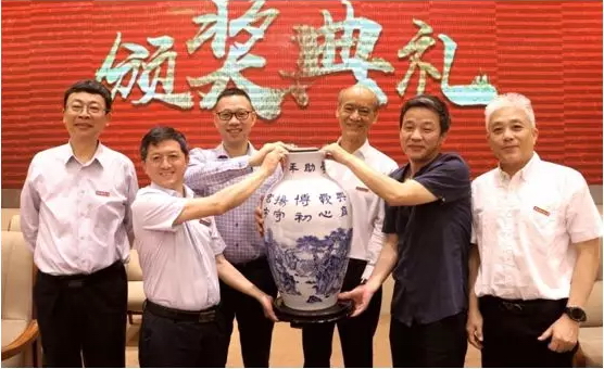 陶大赠送“十年助学”青花瓷瓶给宏宇集团(从左至右:陶大江伟辉书记、陶大材料学院江向平书记、宏宇集团董事长助理叶劲立、宏宇集团顾问欧家瑞、陶大材料学院汪永清副院长、宏宇集团市场总监王勇)