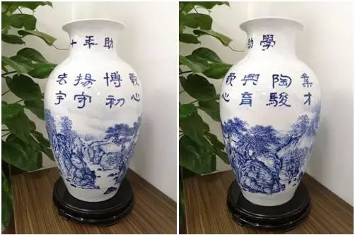 会上,景德镇陶瓷大学为感谢宏宇集团连续九年捐资助学,帮助近千名陶大优秀学子完成学业,特制了一个由工艺美术大师精心制作的青花瓷瓶赠送给宏宇集团。瓷瓶器型雄浑大气,坯白如玉、明如镜,青花爽净舒展,代表了景德镇数千年瓷器制作技艺的最高境界。瓷瓶上书对联一幅: