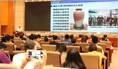 融合了陶瓷、诗词两大中国文化瑰宝的“南风古灶”陶塑,堪称“陶诗相伴”的艺术精品。颁奖典礼后,作为陶大兼职教授的宏宇集团顾问欧家瑞,为在场陶大师生带来了主题为《陶诗相伴点土成金》的讲座。