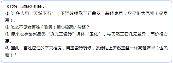 这首诗是宏宇集团顾问欧家瑞为玉瓷砖产品作的诗。透光“玉瓷砖”,质感温润,通透玉如,通过基础材料的创新研发,开创了中国陶瓷行业一大新品类。