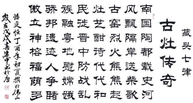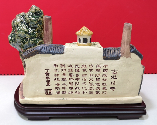 “古灶神韵”不仅是浓缩500年石湾陶瓷文化精髓的陶塑精品,更是“陶诗相伴点土成金”的艺术佳作。其背面雕刻有宏宇集团顾问欧家瑞(笔名悟变恒)创作的一首藏头七律《古灶传奇》,用短短几十字生动阐述南风古灶的历史渊源和文化价值,咏赞“南风古灶民族骄傲”。