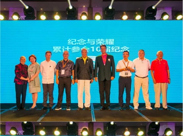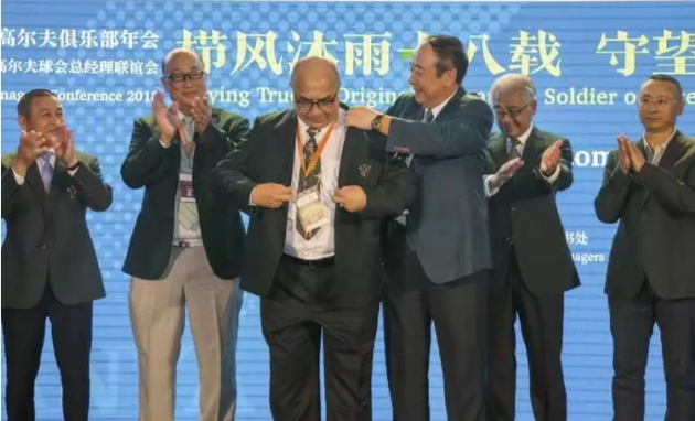 毫无疑问,穿纪念夹克仪式是每届总年会开幕暨欢迎晚宴的重头戏,在过往数届总联会承办球会总经理的见证下,总联会联合创始人、中国高尔夫俱乐部年会秘书长陈亚雄先生为宏宇·三亚红峡谷高尔夫俱乐部总经理侯启明先生穿上象征传统与胜利、印有年会会徽的绿夹克。同时戴耀宗先生、杨辉光先生还为侯启明先生颁发了承办纪念奖杯,以感谢承办球会为年会所付出的艰辛,对承办球会所有工作人员的感谢与敬意。