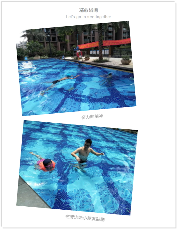 9:30,大小参赛“选手”陆续到场,有姐姐带着弟弟的,有爸爸带着女儿的,有奶奶带着孙子的……场面十分的热闹。活动要求两人一组(两名小朋友或家长带一名小朋友),全程50米游泳接力,以到达终点的时间长短为评比标准,奖项设置第一、二、三名各两个名额。