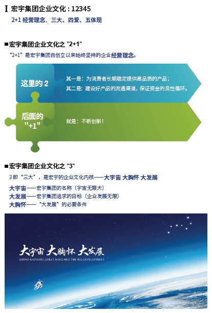 宏宇集团的企业文化,是总结董事长一直以来经营企业的理念和经验而形成,是有自己特色、有思想高度、能落地扎根的系统文化,是在企业经营发展过程中不断实践并不断完善的颇具生命力和发展力的思想体系。