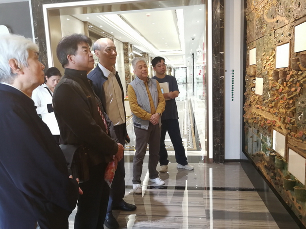2018年3月15日,禅城诗词学会会长林三伟、石湾著名书法家何汝文参观《创新瓷砖重现古镇辉煌》大型陶板画。
