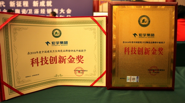 宏宇集团及旗下五大陶瓷品牌凭借强大的企业实力和有口皆碑的市场反响,揽获31项重量级大奖。其中,本次大会最具含金量的“科技创新金奖”被宏宇集团一举摘得。