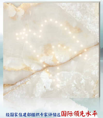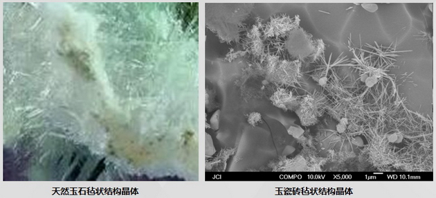 玉瓷砖内部类似玉石的毡状结构晶体,会产生柔和的反光(非直线透光),使物体“通亮”,产生美感。毡状结构里面的“面”都交织在一起,分布均匀而边界模糊,使得砖体像玉石一样手感温润。