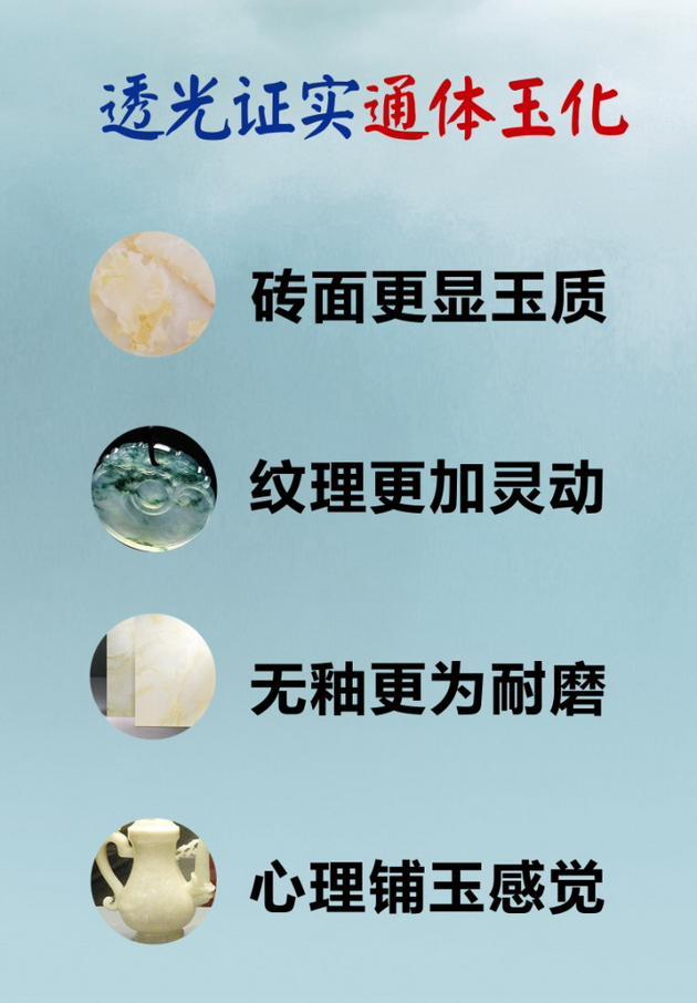 ● “玉瓷砖”烧成温度高达1220多度,且高温区烧成时间特别长,坯体烧结程度高,真正实现“完全玻化”,坯体内部几乎无气孔,避免了光线穿过坯体时的散射。