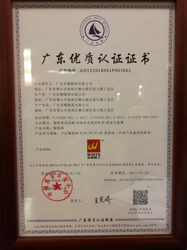 广东宏陶陶瓷有限公司是宏宇集团下属企业,也是中国陶瓷行业的领军企业之一。宏陶凭借强大的企业实力、引领行业的创新能力、19年始终如一对高品质的坚守以及有口皆碑的市场反响,荣膺“广东优质”品牌认证,实至名归。