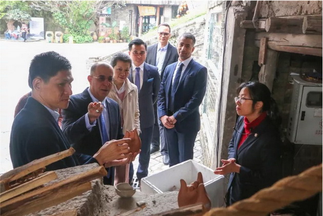 Hilal Alhasani一行对南风古灶古老的龙窑柴烧技艺十分感兴趣,兴致勃勃听取龙窑柴烧介绍。当他得知南风古灶的龙窑已经薪火不灭500年之久,脸上露出吃惊的表情,不住地称赞南风古灶对中华传统技艺的保护工作做得好。