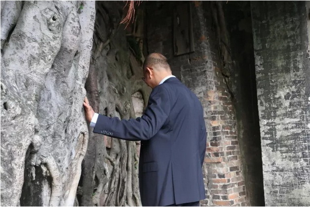 “摸摸榕树头,一生无忧愁”。来到窑尾的古灶神榕下,听到导游介绍古榕树已经与龙窑相伴400多年,Hilal Alhasani一行来宾纷纷上前,踏上“足下安康”的脚印,抚摸榕树。