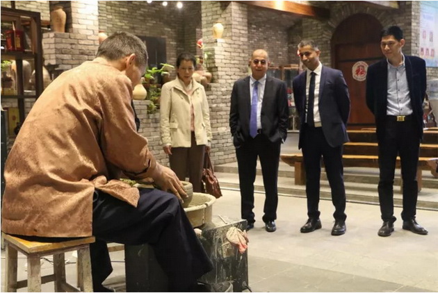 Hilal Alhasani一行来到古窑映像,观看神奇的拉坯表演。他表示,虽然自己的国家也有陶艺制作,但是与中国传统的拉坯技艺大不相同,有机会促进两国陶艺家能进行艺术交流。