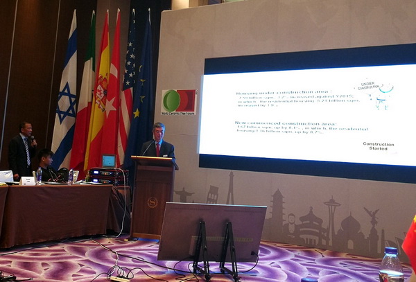 中国建筑卫生陶瓷协会常务副会长缪斌代表中国陶瓷行业作主题发言,介绍中国陶瓷产能、市场消费容量、进出口贸易、环保举措等情况