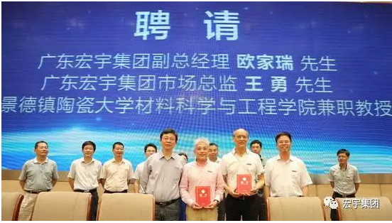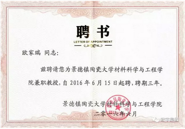 宏宇集团副总经理欧家瑞受聘为景德镇陶瓷大学材料科学与工程学院兼职教授聘书