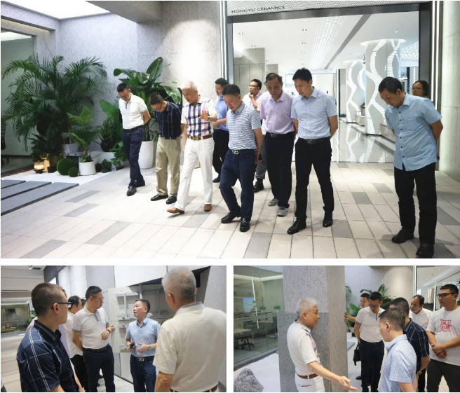 领导嘉宾一行首先来到宏宇陶瓷总部展厅参观。宏宇集团市场总监王勇为来访嘉宾详细介绍了宏宇集团的发展历程、企业文化、产业布局,并着重介绍了新产品花岗岩景观砖。