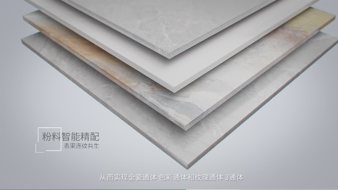 「和璧岩·通体」采用的数码智能布料系统,把所有粉料(白料和各种有色粉料)根据表面喷墨渗花图案、纹理、色调的文件同步布料这样完美打造瓷砖色感、纹理、材质三位一体,瓷砖表面与加工面肌理天然配对,随意拉槽、倒边、倒角,完美解决白线问题,发现家装更多可能。