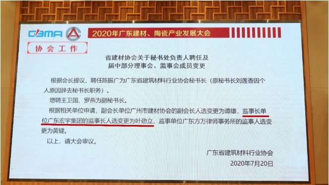 会上,协会秘书长王卫国宣读协会提名,广东宏宇集团有限公司董事长助理叶劲立新任广东省建筑材料行业协会第四届理事会监事长。