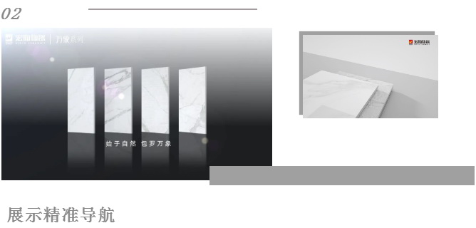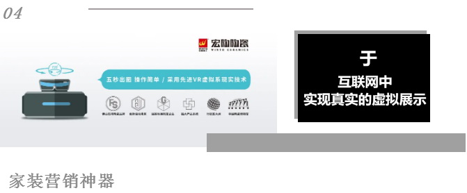 如今市场消费者注重购买体验,单一效果展示难以再满足客户高层次的需求。宏陶陶瓷结合全景VR技术,推出线上展厅,让客户足不出户,就可以将产品尽收眼底,还可以实现线上选购,感受宏陶陶瓷精工品质、精彩生活。