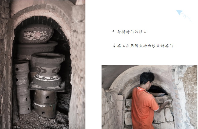 窑工在炎热的窑背上从第3排开始,由低至高,一排一排地依次序把小木柴投进火眼,窑炉迅速升温,“火膛”通红,温度高达1300度